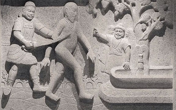 (Photo of stone sculpture depicting Shiva Brahmendra’s arm being cut off.)